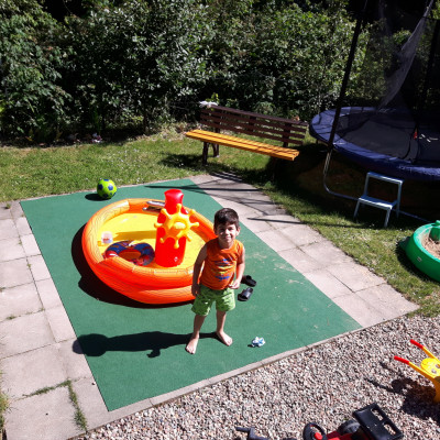 Wir gehen mit den Kindern allerdings nicht nur zum Spielplatz und entdecken die Natur zusammen mit ihnen, sondern auch in unserem Hof finden wir genug Platz um bei sonnigem und warmem Wetter ein Planschbecken aufzubauen.